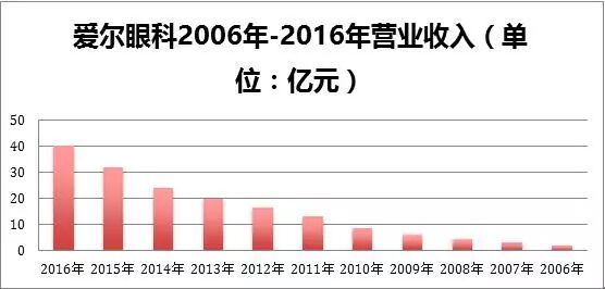 从私立眼科龙头上市公司爱尔眼科的财报中可以看出,公司自有记载的经营数据开始,从2006年的1.91亿到2016年的40亿,11年间营业收入增加了近20倍,而同比国内的眼科服务市场增量,据卫计委提供的统计年鉴,2005年眼科专业医院的收入是16亿,到2015年整个规模为140亿,11年间增加了近8倍。