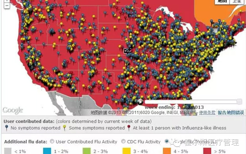 图1:谷歌流感趋势工具通过跟踪搜索词所判断的流感发病率,并与美国疾病控制和预防中心的报告比对。