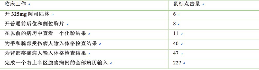 平均鼠标点击率,每小时400次,按每10小时一档急诊班计算,每个临床工作者在一档班的时间内要点击鼠标4000次。